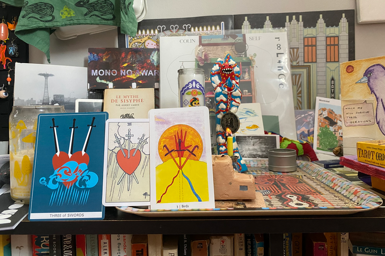 The much harder task, of course, is to know that no beautiful thing can last long. I felt divine and impermanent all Saturday night and into Sunday, all sadness obliterated for a few bright moments. Yet as soon as I said goodbye to Matt and Sasha on Monday morning, sending them off after meeting for coffee at the Art Institute, I knew I needed the sadness welling up to reorient my perception, necessary to reintegrate a joy that was too fragile to hold long. In meditation, I pulled the Three of Birds card from the Shining Tribe Tarot deck (Three of Swords in traditional Tarot), a card that encouraged me to accept the sadness as a gift as well, to trust in what it needed to say. Looking at the three swords and what they might symbolize, I pictured three different ways we find ourselves separated from others on this earth.